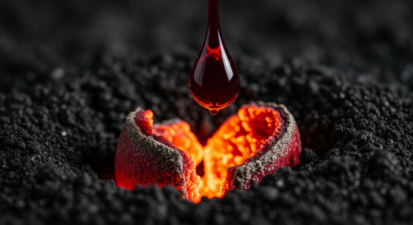 A glowing coal breaks through a crust of grey ash, mirroring a fresh physical wound. These events share a physical architecture of boundary rupture where a high-energy interior violently meets the exterior. Crimson synthesizes this paradox of a biological system actively crossing the threshold from life to death. You directly perceive the extreme stakes of a compromised core.